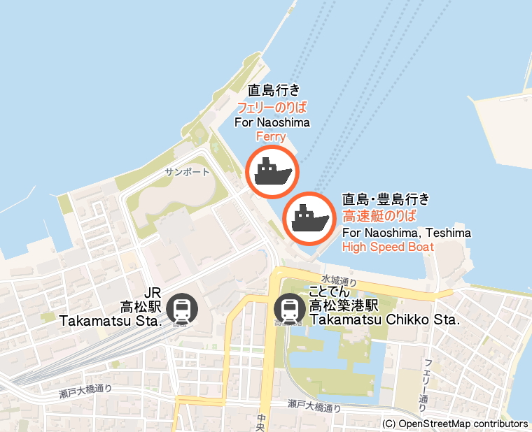 Naoshima and Teshima are closer to and have more frequent vessel services from Uno Port in Okayama than from Takamatsu Port. Uno Port is close to JR Uno Station.