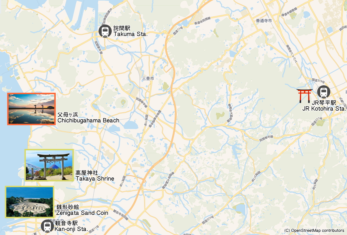 If you are travelling by public transportation, the beach is far from both JR Takuma Station and JR Kan-onji Station, the nearest stations, and is accessible only by bus or taxi.