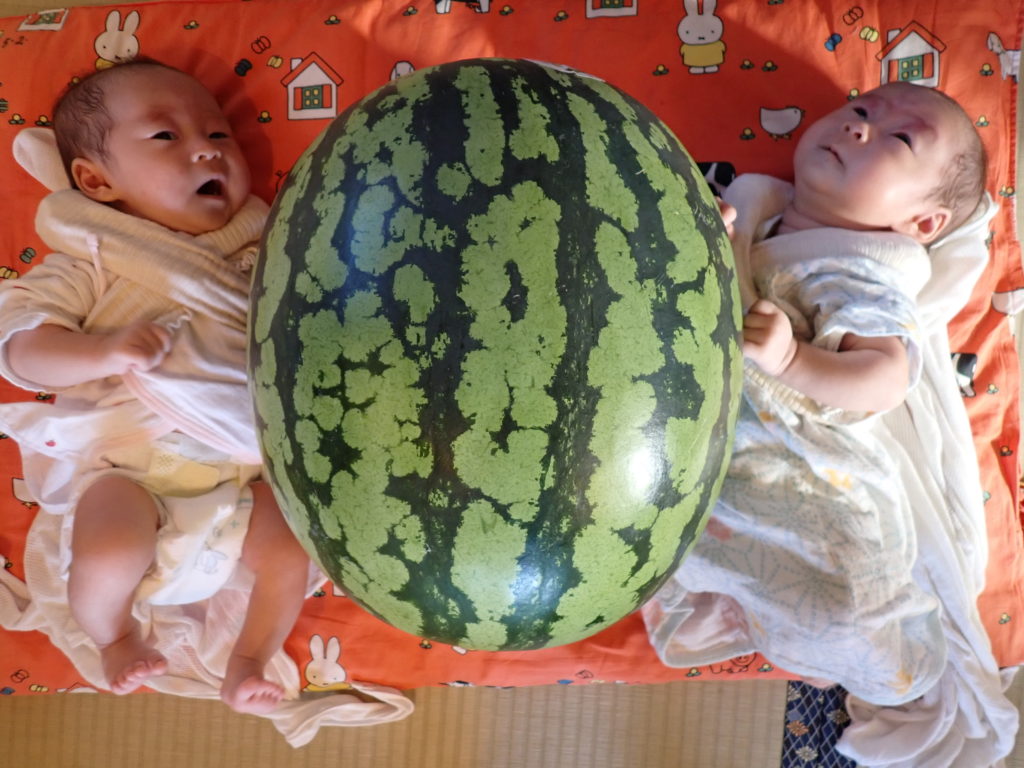 さて、大きいといえばこのスイカ。このスイカも10年来、若葉屋に泊まりに来てくださっている常連さんから出産祝いにいただいたものです。
