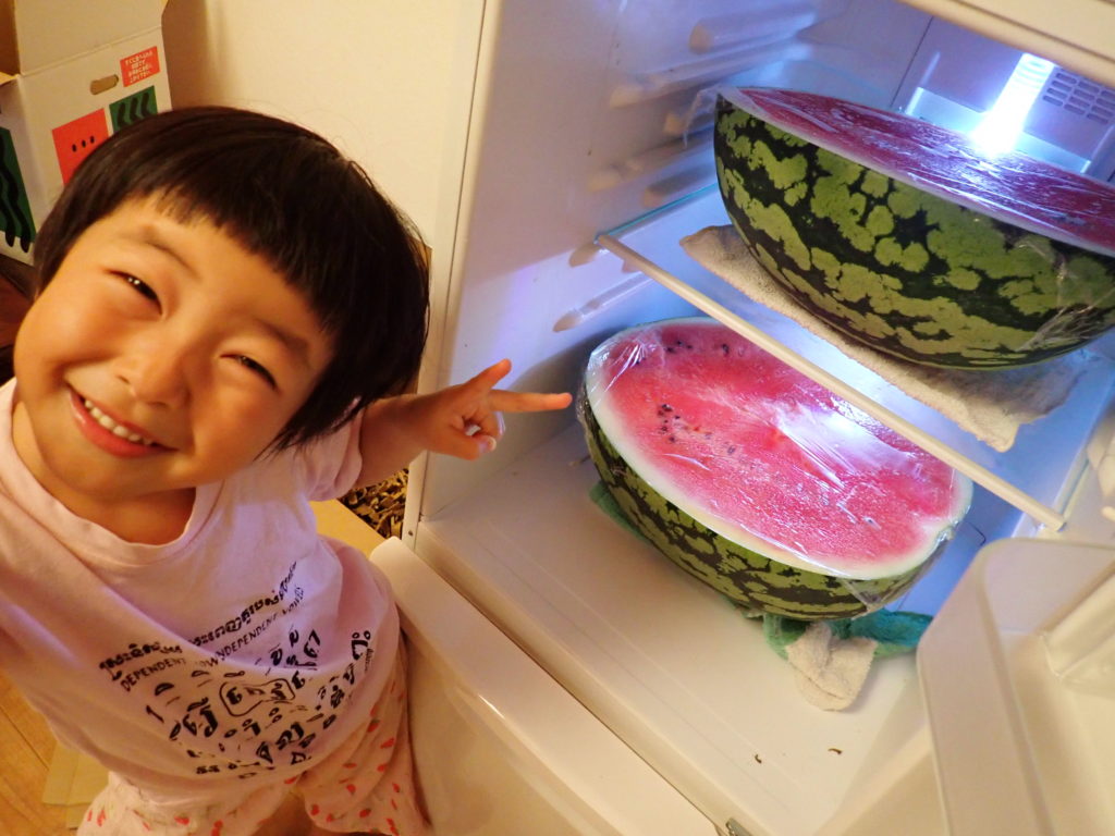 Fortunately, the refrigerator in Wakabaya, which had been closed for months, was empty. So, as you can see, we were able to chill this huge watermelon. Thank you!