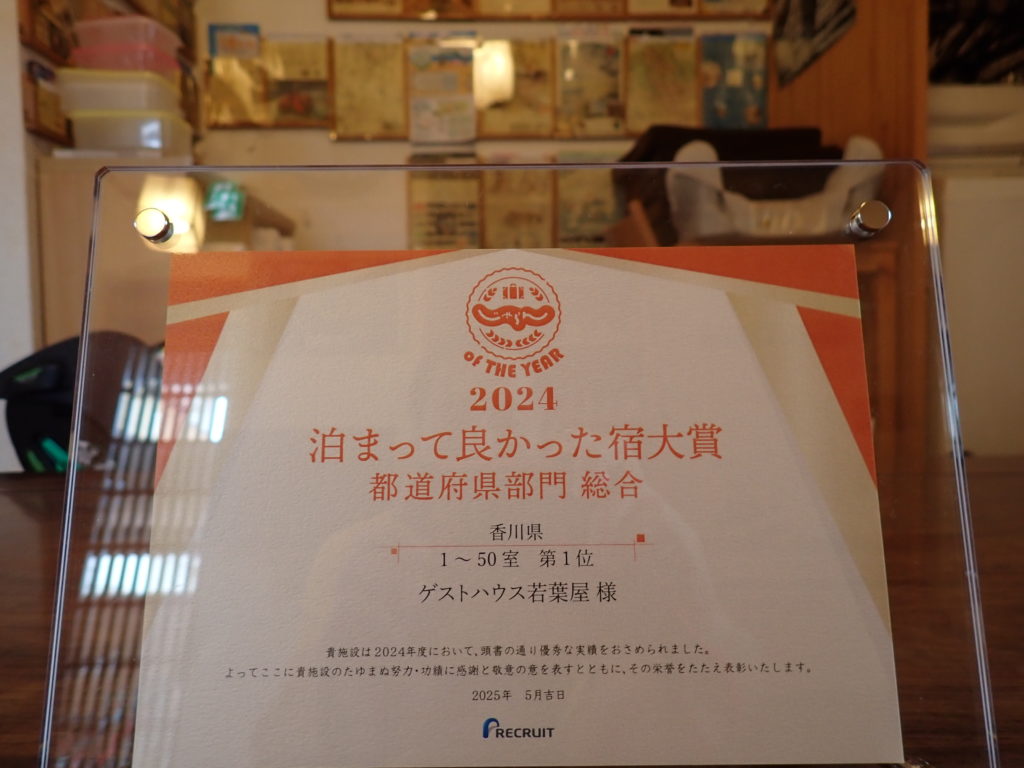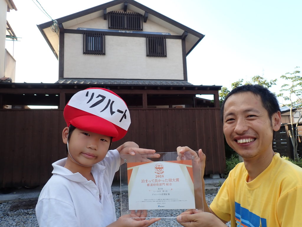 At around the same time, we received something else from Recruit, the operator of the online booking website Jalan-net. Guest House Wakabaya had won first place in the ‘Best Accommodation Award, Prefectural Division, Overall’ category for Kagawa Prefecture (1–50 rooms)! I asked our second son, Kiichi, to be a Mr Recruit for the ceremony.