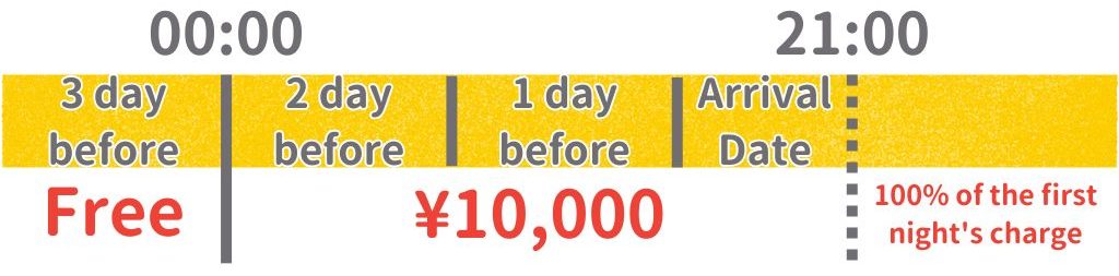- No-show with no contact by 20:59 on the check-in date: 100% of the first night’s charge as the cancellation fee. We will charge the cancellation fee via online credit card payment, calculated as the first night’s stay minus the deposit of 10,000 yen.