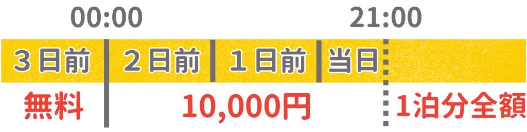 - チェックイン日の2日前からチェックイン当日20:59まで: キャンセル料10,000円。前入金分10,000円全額をキャンセル料として頂戴しますので、返金はございません。(例: チェックイン日が10月30日の場合、10月28日0:00から10月30日20:59までにキャンセル連絡をいただければ、キャンセル料10,000円)